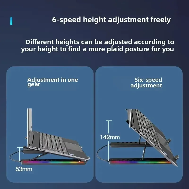 【Multi-functional RGB Illuminating Laptop Stand】: Crafted from aluminum alloy with a hollow design, it enhances air circulation and accelerates the heat dissipation speed, which is more conducive to the ventilation and cooling of the computer. The RGB lighting effect offers multiple lighting modes: 6 dynamic light effect modes + 6 static monochrome constant light effect modes.